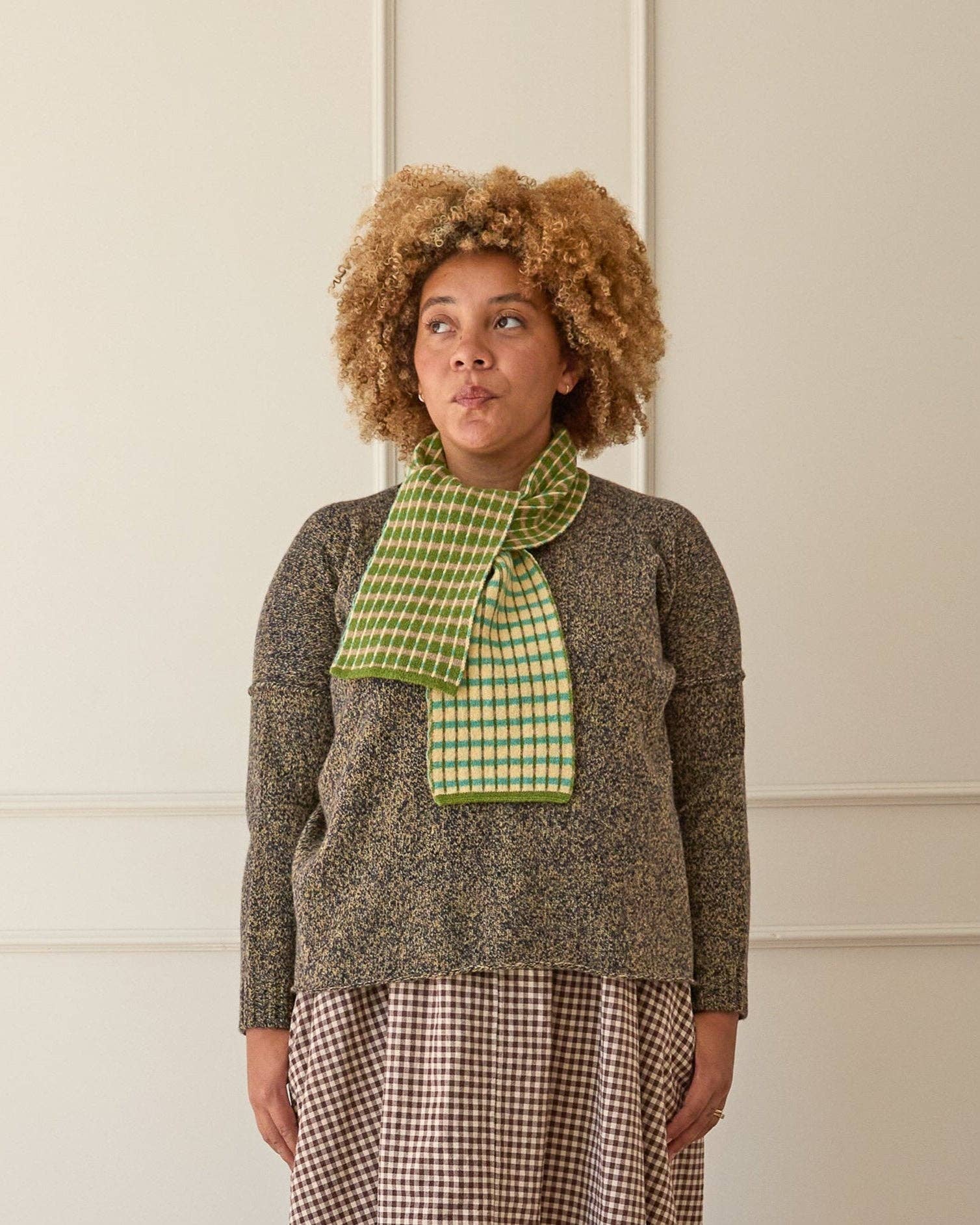This soft, woollen scarf features a captivating pattern inspired by traditional Japanese mending stitches, the process known as 'Boro' was historically used to extend the lifespan of clothing and textiles. This colour way features, Zingy Matcha Green, Pale Yellow, Fawn and Catkin. The scarf's reversible design showcases the inverse colours on the other side, providing you with two unique looks in one. Crafted with care, this neat little scarf boasts a double thickness knit, ensuring exceptional warmth whilst still small enough to fit under your collar. It's the perfect companion for braving the elements. Its timeless appeal and unisex design make it a must-have accessory for anyone seeking a blend of fashion and functionality. Materials: 100% Merino Lambs wool, spun in Yorkshire. Our wool is ethically sourced from farms that do not practise mulesing.